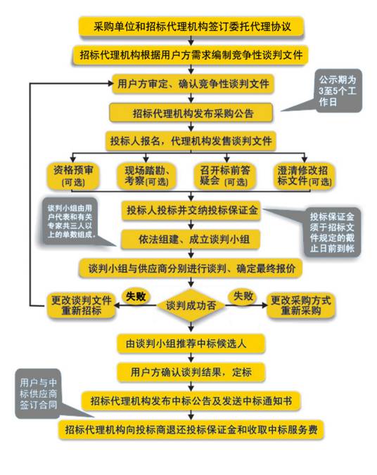 竞争性谈判是指采购人或代理机构通过与多家供应商(不少3 家) 进行谈判,最后从中确定中标供应商的一种采购方式。