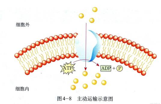 主动运输(active transport)质膜上的载体蛋白将离子、营养物和代谢物等逆电化学梯度从低浓度侧向高浓度侧的耗能运输。所耗能量由具ATP酶活性的膜蛋白分解ATP提供。例如正常生理条件下,人红细胞内K+的浓度相当于血浆中的30倍,但K+仍能从血浆进入红细胞内,Na+浓度比血浆中低很多,但Na+仍由红细胞向血浆透出,呈现一种逆浓度梯度的“上坡”运输。