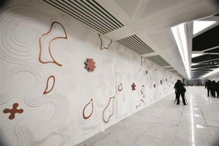 新荣站以“新荣欣韵”为设计主题,取自“新荣”谐音,有欣欣向荣的美好寓意。此外,站中的墙面采用抽象丘陵梯田造型,线条柔美,“光花”随着灯光依次点亮,花开花闭、生动梦幻。层层叠叠的起伏结构配合“光花”的光晕投射,营造出层次丰富的视觉效果,具有科技感 。