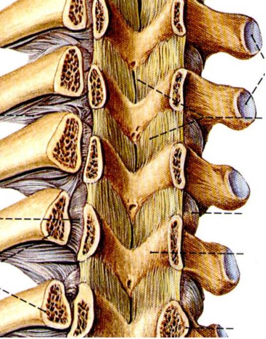 向外侧黄韧带附着部可延伸到椎间关节囊,向内侧则一直延伸到中线椎板形成棘突处。