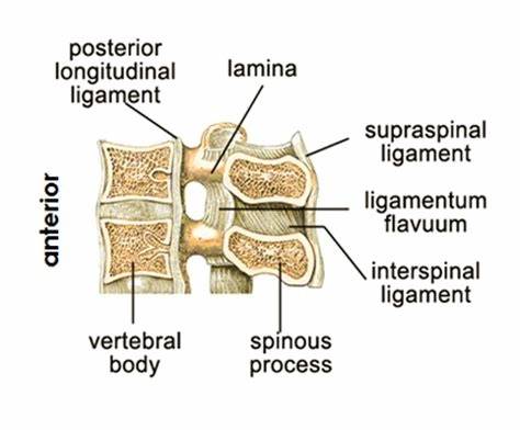棘间韧带:棘间韧带是较薄弱的韧带,连接上、下两棘突,前面连接黄韧带,后方移行于棘上韧带。连结2个相邻脊椎棘突之间的韧带,叫棘间韧带。此韧带较薄,沿棘突根部至尖部,连结于相邻的2个棘突之间,前方与椎骨间韧带愈合,后方移行于棘上韧带。棘间韧带在腰部宽而厚,呈方形;胸椎部窄而长;颈椎部较薄弱。其功能是加强脊椎间的牢固性,并可限制脊椎过度前屈。如脊椎突然过度前屈可损伤此韧带。