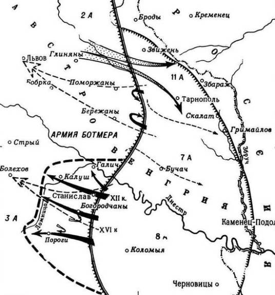 最后一个动手的是位于俄军左翼、由拉夫尔·格奥尔吉耶维奇·科尔尼洛夫将军指挥的第8集团军。这支部队在7日才投入进攻,但收获却最多。第一天的战斗中,该部就在奥匈第3集团军的防线上打出缺口,第二天进一步夺取了哈利采。奥匈司令官匆忙投入预备队,但这些兵力丝毫不起作用。经过3天推进,科尔尼洛夫宣称俘虏敌军1万余名,缴获大炮80门。