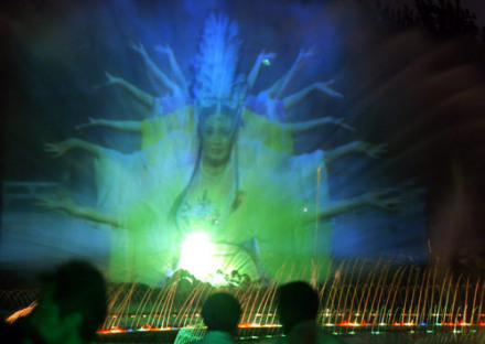 与一常规电影完全不同。它是利用高压水泵通过特制的喷头,将水自下而上喷出,使水雾化并形成扇面形银幕。此银幕与自然界的夜空连成一片,人物出入画面,忽而腾起飞向天空,忽而又从天而降,产生一种虚幻缥缈的感觉,似海市蜃楼。水幕电影在我国还很少见。环幕