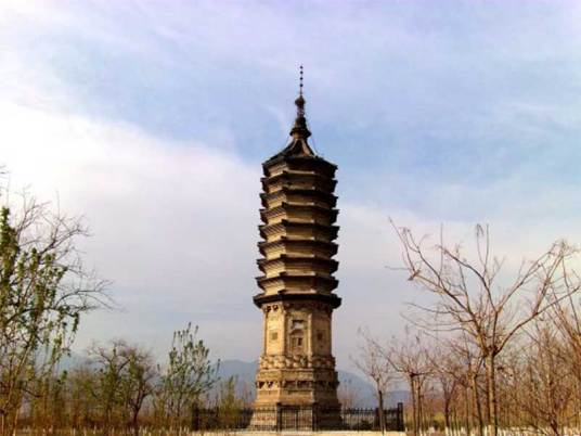 姚广孝墓塔,位于北京市房山区青龙湖镇常乐寺村。是明成祖朱棣的重臣姚广孝的墓塔。该墓塔始建于永乐十六年(1418年),于宣德元年(1426年)建成。该塔是一座八角九级的砖石重檐塔,高33米,顶部塔刹高3米。姚广孝墓塔,整座塔坐落在一级四方形的平台上。最下面是八角形基座,基座上立有两层八角形须弥座。须弥座式塔座束腰浮雕寿字和菊花、莲花和西番莲花的造型图案,其上为三层外顷的莲花瓣。中间塔身,四正面雕仿木隐作隔扇假门,其它四面则雕有仿木棂假窗。正面门楣之上嵌方石一块,其上楷书:“太子少师赠荣国恭靖公姚广孝之塔”。塔身往上是九层叠涩檐,各角均悬铜铃,塔刹为铁制,装似葫芦,为莲花形刹座的仰莲托着球形刹身,刹杆串起的相轮、圆光、仰月和宝珠。刹由八条铁链锢之于檐角上。姚广孝墓塔整体结构匀称,塔身上的花卉图案别致,且雕刻精细。整个塔身轮廓清秀而挺拔,体现出明代塔的建筑风格。2013年3月5日,姚广孝墓塔被国务院公布为第七批全国重点文物保护单位。
