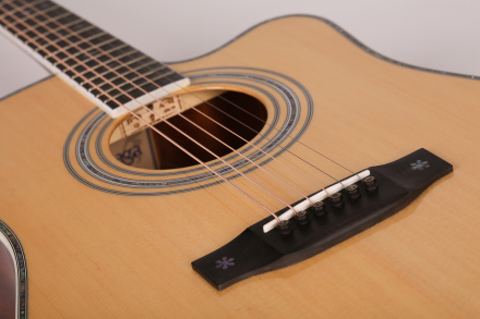 即老百姓们常见的弹唱吉他。正规的民谣吉他,它的琴弦是用六个白色固弦钉固定在琴码上的,各弦之间距离为7mm,共鸣箱结合处在14品。特点:1.钢丝弦。2.个头比较大些,琴颈较细。3.琴弦为钢弦与琴箱接头处为十四品。4.表面板上可能有一块半月形保护板。5.油漆往往较花哨,欠庄重。以伴奏为主。