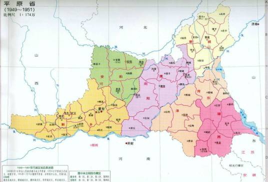 中华人民共和国成立后,设立平原省,省会新乡市,由中央直接领导。辖新乡、安阳、湖西、菏泽、聊城、濮阳等6专区,新乡市、安阳市2地级市,共56县、1矿区、5镇。