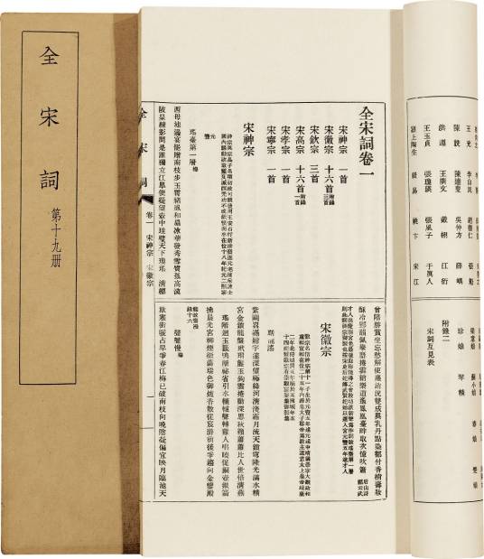宋词总集。今人唐圭璋编。宋人词集丛刻,始自明末毛晋《宋六十名家词》。其后,清代侯文灿刻有《十名家词集》,秦恩复刻有《词学丛书》。晚清刊刻词集之风更盛,规模也更大。王鹏运刻有《四印斋所刻词》及《宋元三十一家词》,江标刻有《宋元名家词》,吴重熹刻有《山左人词》,吴昌绶刻有《双照楼景刊宋元本词》,朱祖谋刻有《彊村丛书》,陶湘刻有《续刊景宋金元明本词》。