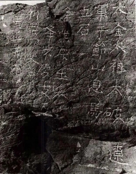 庆云摩崖石刻东侧石壁,面南偏东,石高2.45米,面宽1.1~2.5米不等,右上角上刻有“大金太祖大破辽军于节山息马立石”3行15字,右起竖书楷字,字迹清晰。其左侧另有女真字4行23字,大约是汉字的对译。