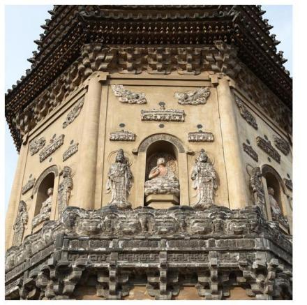 崇兴寺东西双塔的差异主要体现在各段高度不同,以及第1层塔身的装饰不同。双塔塔身各段高度、收分的差异并非当时刻意追求不同,而是双塔并非同期所建。东塔的八方主尊和胁侍,身材纤弱,辽风较淡,与西塔造像风格差异较大,应该是后世维修的结果。