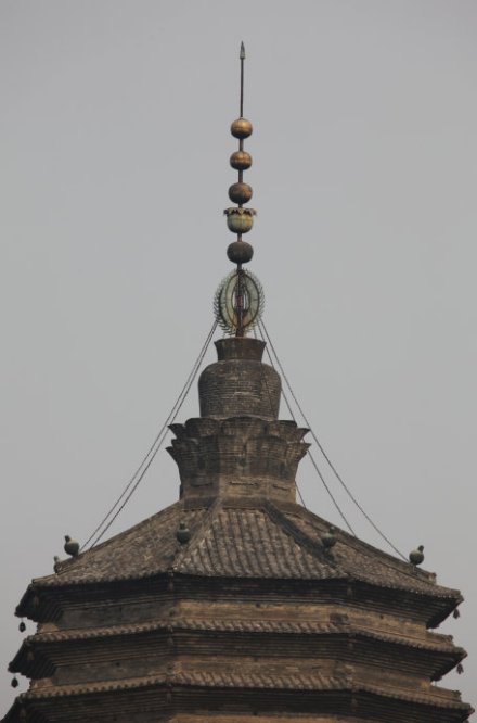塔顶为砖砌覆钵及仰莲,高6.8米,上栓8根铁链,每根长14.15米,分别于8角垂脊宝瓶相连。塔刹上竖刹杆,高9.9米,直径0.9米,中穿宝珠5个,火焰环、项轮各1个。宝珠鎏金铜质,周长2.94米,高0.8米。宝珠下系火焰环,周长2.3米,相轮在2至3宝珠之间。刹杆帽为铜铸小塔