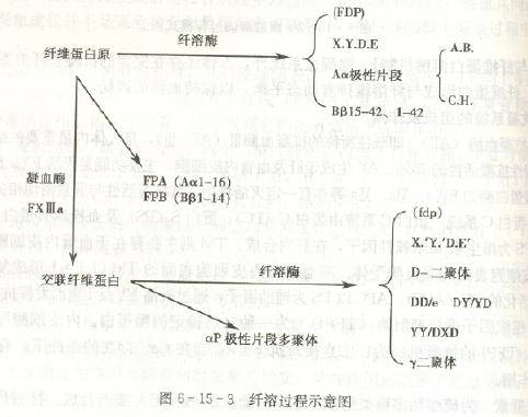 (2)纤维蛋白(原)降解机制:PL不仅降解纤维蛋白,而且可以降解纤维蛋白原。PL降解纤维蛋白原产生X片段、Y片段及D、E片段。降解纤维蛋白则产生x'、Y'、D-D、E'片段。上述所有的片段统称为纤维蛋白降解产物(FDP)。
