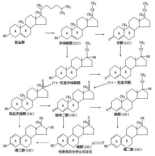 性激素有共同的生物合成途径:以胆固醇为前体,通过侧链的缩短,先产生21碳的孕酮或孕烯醇酮,继而去侧链后衍变为19碳的雄激素,再通过A环芳香化而生成18碳的雌激素。性激素的代谢失活途径也大致相同,即在肝、肾等代谢器官中形成葡萄糖醛酸酯或硫酸酯等水溶性较强的结合物,然后随尿排出,或随胆汁进入肠道由粪便排出。