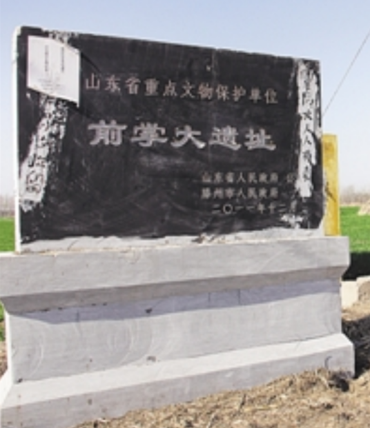 前掌大遗址南北长约500米,东西宽约200米,占地面积约200000平方米。前掌大是一处重要的商代遗址,既有居住生活的遗迹,又有高规格的贵族墓地,同时还发现了史前人类生存活动的痕迹。1994年冬出土的西周早期青铜礼器、兵器、玉器、酒器等,出土了疑是3000年前酒的液体,被列为当年全国十大考古发现之一。