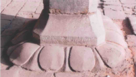 西顿济渎庙前檐四根石柱,每根石柱上都刻有宋宣和四年(1122年)顿村西社村民的施柱题记。其中,心间的两根为篆书,角柱的两根为楷书。类似北宋末年的篆书题刻,在晋东南还是第一次见到。石柱下用方形的覆莲柱础,莲瓣肥厚,是本地典型的金代石作。独特之处在于,石柱和柱础间多了一个同样是抹角的石柱櫍,而且柱櫍较高。