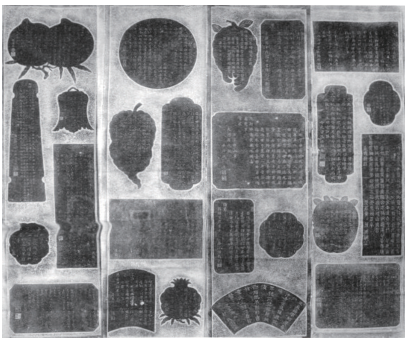 14通碑刻,分为四扇屏风式布局。第一扇屏风题刻为一至三号格扇心屉题赞图案;第二扇屏风题刻为四至七格扇心屉题赞图案;第三扇屏风题刻为八至十一号题赞图案;第四扇屏风题刻为十二至十四号格扇心屉题赞图案。除第一扇第一格为序言,为一整块条幅形题刻,第四扇第十四格为后记,也为一整块条幅形题刻外,其余十二格每格均为由六幅不同艺术造型的题刻组成,除传统的方形、长方形、团扇、扇面形外,还有各种寓意美好的双桃形、钟形、悬磬形,柿子形,石榴形、玉圭形等。桃子寓意着添寿;石榴寓意着子孙繁盛;莲花寓意着品行高洁;荷叶寓意着和平;佛手果寓意着长寿;玉圭、玉璋、玉璧等玉器更是品行高洁的象征;钟磬都是礼乐文化的象征;折页、手卷样则极具文墨之风;尤其是第九格,柿子与如意形同时存在,寓意事事(柿柿)如意。这种布局风格的石碑楼较为少见。