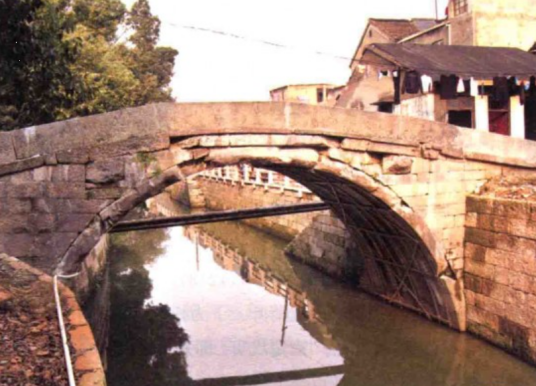 杭州忠义桥为单孔圆弧形石拱桥,桥长18米,净跨8.4米,桥宽3.5米。拱券采用分节并列砌筑法,用7块弧形条石组成一个拱形结构,全桥由32块拱石砌成。