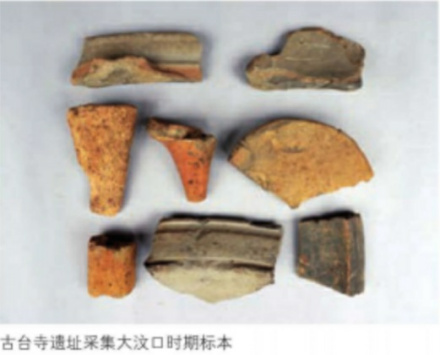古台寺新石器早期文化堆积中,遗物均见陶器碎片,陶器均为手制,火候低,陶质软,色不纯,外表多为红褐色或灰褐色,内表多为灰黑色。其中夹砂陶占91%,泥质红陶占8%,泥质灰陶占1%。夹砂陶中夹蚌片陶约占4%。陶器表面粗糙,泥质红陶中有一片施陶衣,手触即掉,应是陶器烧成后涂上的。陶器多素面,有少量的纹饰,以戳印纹为特点,线点比较密集。陶器基本器型以釜、鼎、罐类为主,器物的口沿外普遍有一周凸棱。该遗址早期文化遗存的文化面貌与小山口遗址早期文化有许多相同之处。如二者的陶器均为手制,火候低,陶质软,制作粗糙,以夹砂红陶为主,其中夹蚌片、夹草木灰的陶片占较高的比例。陶色不纯,有的呈橘黄色,有的呈灰褐色,但多以外红内黑为特点。发掘报告认为小山口遗址和古台寺遗址的早期遗存应属同一文化类型,距今约8000年。