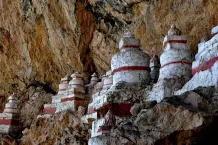 灵塔群坐西朝东,因格萨尔叔父达荣·晁通等笃信苯教,故所修灵塔分两处山洞而建,左边山洞中有岭国长系达荣·晁通王的灵塔和他的两个儿子及部将之灵塔。右边是以格萨尔王为主的岭国幼系灵塔群。塔身宝瓶上写有岭国部将的名字,均为古藏文,都是用藏文短脚体写成的。因年代久远和自然因素,其他灵塔名已模糊难辨。塔中装藏有珍贵的擦擦,塔形集印度佛塔的基本规格和西藏本土宗教苯教审美风格为一体,是早期藏式灵塔营造风格和建筑艺术的实样。