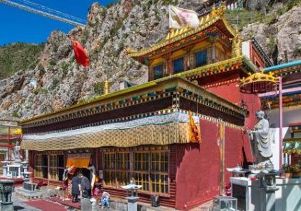 贝大日如来佛石窟寺,又称文成公主庙,别名“加萨公主庙”。寺庙依山而建,坐北朝南,包括建筑、岩壁浮雕佛像及岩刻汉藏经文三个部分。寺庙主体是三重檐、二角攒尖的一座褐红色建筑,外表看似共分三层,内部实为一堂。岩壁浮雕佛像共9尊,其主佛大日如来位居正中,施禅定印,结跏趺坐在狮子莲花座上,娴静庄严。其余八尊浮雕均为立像,为八大随侍菩萨,造型、服饰兼有吐蕃早期风格和初唐中原艺术特征。造像一侧有藏文题名。佛像两旁的崖壁上,勒有兰查体古藏文和汉文佛经,相传是吐蕃大臣吞弥·桑布扎和文成公主的手书。由于年深日久,字迹模糊,较难辨认。文成公主庙周边的山上挂满经幡,色彩斑斓。