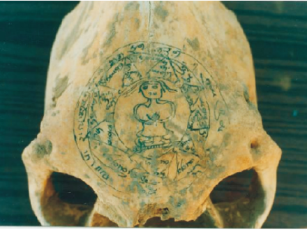 考肖图古城遗址塔基北侧凸出的马面形结构中,出土三件有墨书图案的马头骨,其中两件上面带有写满古藏文的同心圆图案,中心画一带枷锁人物;另一件上面仅见文字,不见人形图案。