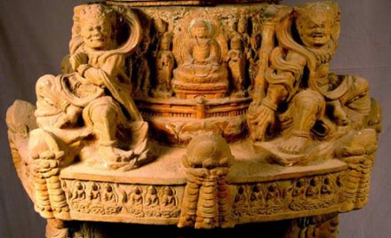 第二级,四角分别雕刻捍卫佛座,雕刻佛像及释迦牟尼像,脸纹清晰,衣褶隆起,形象逼真。