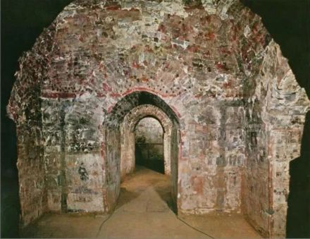 前室平面方形,长2.9米,宽2.85米,南北各附大小相同的长方形耳室。中、后室均呈方形平面。墓墙用长条砖自下而上平铺直砌,第一层是用三砖错缝平铺,以上砌法则用侧立横砌,向上交替筑至10至12层以上,叠沚收顶。甬道顶均筑成三层平列券顶。各室墓顶为穹庐顶。部分墓底有铺地砖,砖表面印有突起的菱形纹,中间有“子孙繁昌富乐未央”隶书,还有一种长方形素面铺地砖。