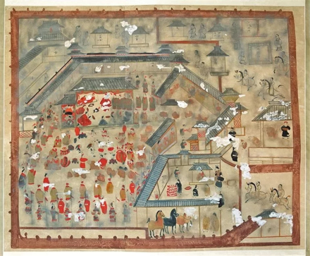 《幕府图》描绘得最为详细,是墓葬画面的核心部分。整个幕府分为堂、营舍和庖舍3部分。营舍位于幕府后院,为幕府中管理军务的机构所在,庖舍位于幕府的西南角,掌管幕府厨饮之事。营舍位于幕府后院堂院为高大的庑殿式房屋,墓主人端坐堂上,堂下艺人在表演乐舞杂耍,身着民族服饰人物伏拜觐见,周围环立官吏武士,场面喧嚣隆重。
