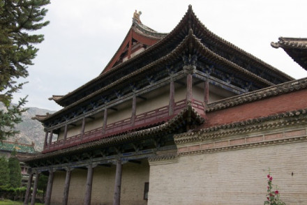 大雄宝殿。由入门面阔 3 间重檐两楼。南厅经堂、北厅佛殿三者色连一体,三殿顶均是歇山式,经堂东、西、南三面由白色藏式砖墙相围,构成了汉藏结合的建筑体。佛殿西壁下部绘一组蒙古贵族礼佛图。