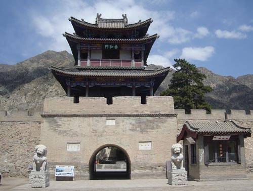 古城。是一座不太规则的方城,南门是正门。墙土夯层筑外包石块,城门内侧筑有马道由此登上城墙,城门台上筑歇山式顶二楼三檐城楼( 1985 年依原式生建)。泰和门起古老于 1606 年,晚于封顺义王 35 年,阿勒坦汗逝后之 25 年在,古城始建早于泰和门 40 多年,召内主要建筑坐北朝南。