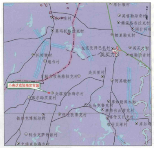 小央达克协海尔古城遗址位于新疆维吾尔自治区阿克苏地区沙雅县英买力镇央塔克协海尔村4组西约500米。