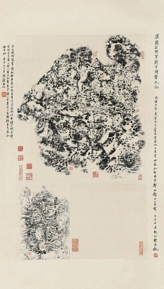 ①上海图书馆藏本。此本为清代光绪九年(1883年)施补华监拓本,题名为“龟兹左将军刘平国摩崖”,上有盛昱抄录释文,徐继孺补录施补华跋,樊增祥、端方、王瓘、徐郙、周大烈跋,李文田题诗,潘祖荫题端,廖平、郑杲、于霖达、黄绍箕、黄国瑾观款。2020年10月30日,此本被文化和旅游部公布为第六批国家珍贵古籍(编号:12890)。