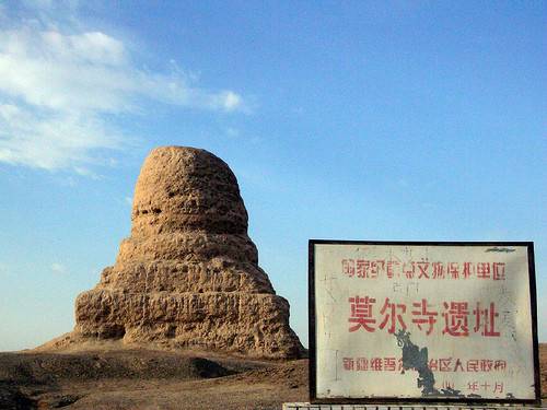 19世纪末20世纪初,西方探险队在新疆四处侵扰文化遗址,搜寻佛像、壁画、文书、木简等文物时发现莫尔寺遗址。