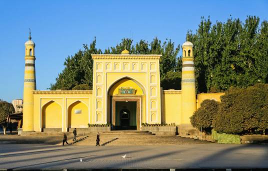 中国伊斯兰教著名清真寺,位于新疆维吾尔自治区喀什市的艾提尕尔广场西侧,始建于1442年,南北长140米,东西宽120米,占地总面积为1.68万平方米,分为“正殿”“外殿”“教经堂”“院落”“拱拜孜”“宣礼塔”和“大门”等七部分,是新疆规模最大的清真寺。