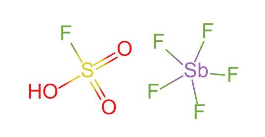 性质与稳定性:当质子酸与路易氏酸混合时,其酸的强度增大。典型的代表是氟硫酸与五氟化锑两者以1:1的混合体系,被称为魔酸。在室温下为无色透明的黏稠状液体,它是一种最强的酸。在魔酸中几乎所有的有机化合物都可以发生离子化。魔酸组成之一的SbF5为无色黏稠状液体,与湿气接触产生白烟,是一种非常强的路易氏酸,能与多种化合物形成加成产物。