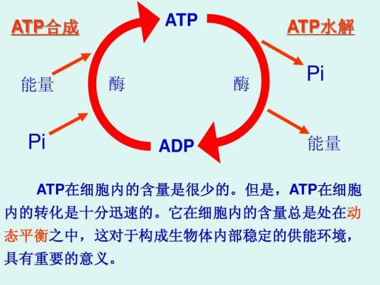 ATP与ADP相互转化是十分迅速的,细胞中的ATP的含量尽管不多,但总处于一个动态平衡中,这对构成生物体内部稳定的供能环境有重要意义。ATP水解时释放出的能量,是生物体维持细胞分裂、矿质元素的吸收和肌肉收缩等生命活动所需要的直接来源。