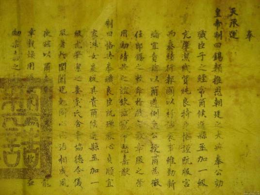清沿明制,有制度规定:封赠官员首先由吏部和兵部提准被封赠人的职务及姓名,而后翰林院依式撰拟文字。届封典时,中书科缮写,经内阁诰敕房核对无误后,加盖御宝颁发。