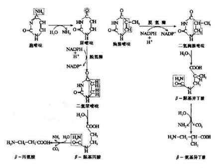 嘧啶核苷酸的分解代谢是先去除磷酸和核糖生成嘧啶碱,嘧啶碱在肝内降解。降解产物易溶于水,这点与嘌呤碱不同,嘌呤碱的代谢产物尿酸仅微溶于水。嘧啶环中的脲基碳以形式从呼吸排出,并产生β-丙氨酸(有生理意义,为鹅肌肽、肌肽及泛酸的成分)及β-氨基异丁酸(经代谢进入三羧酸循环)。