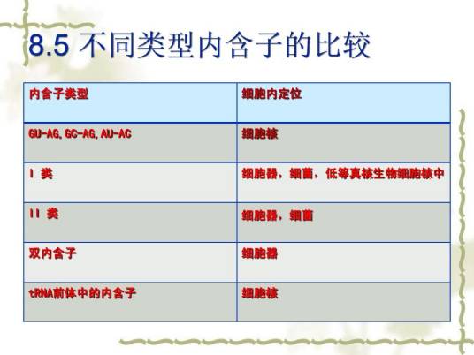 (以上第3,4种内含子不同于第1,2种内含子:因为其内含子本身具有催化活性,能进行内含子的自我剪接,而无需借助于形成剪接体。)